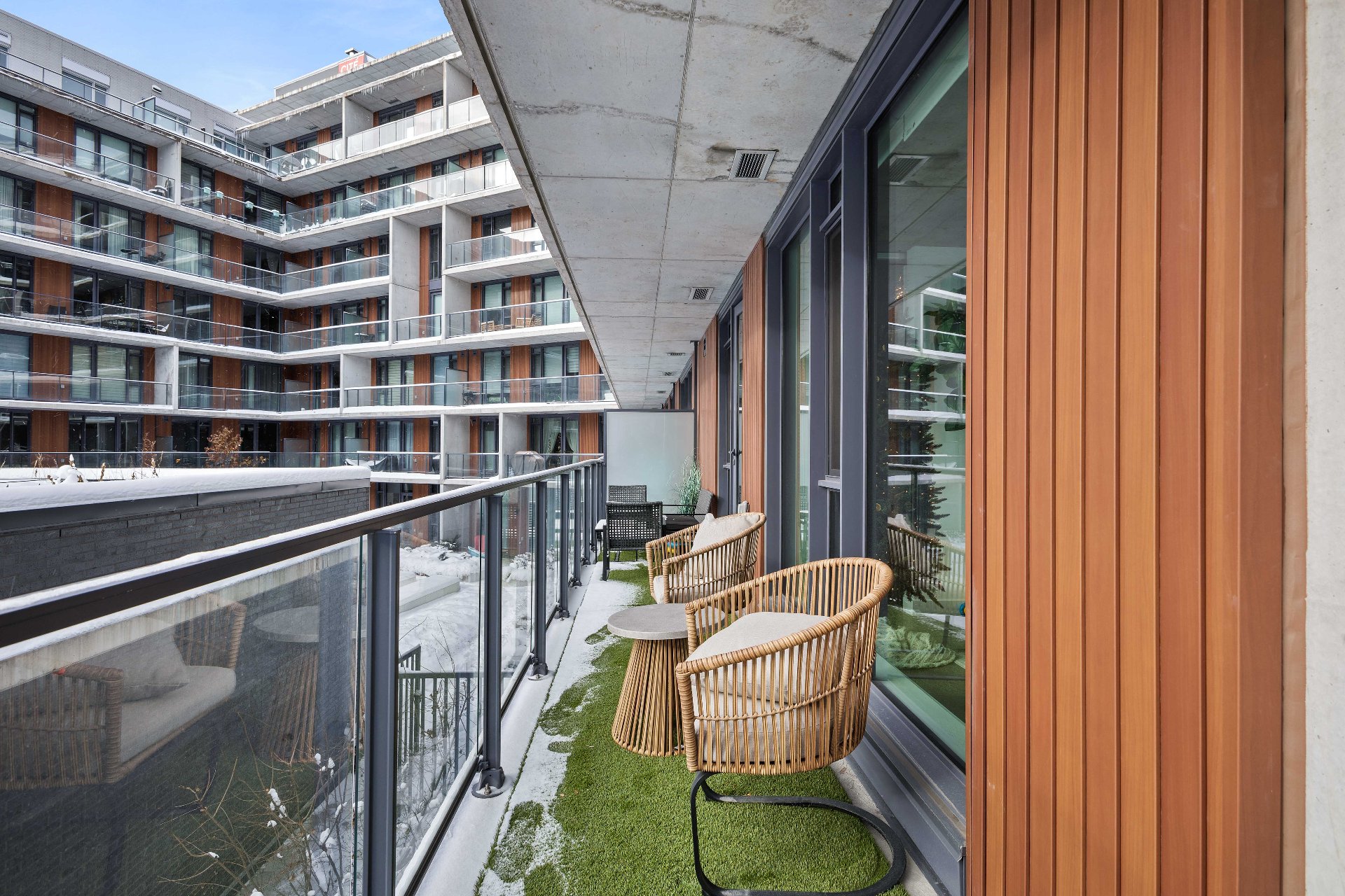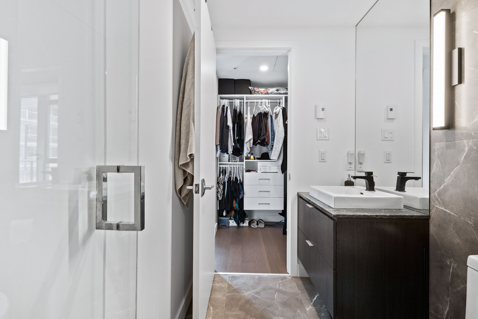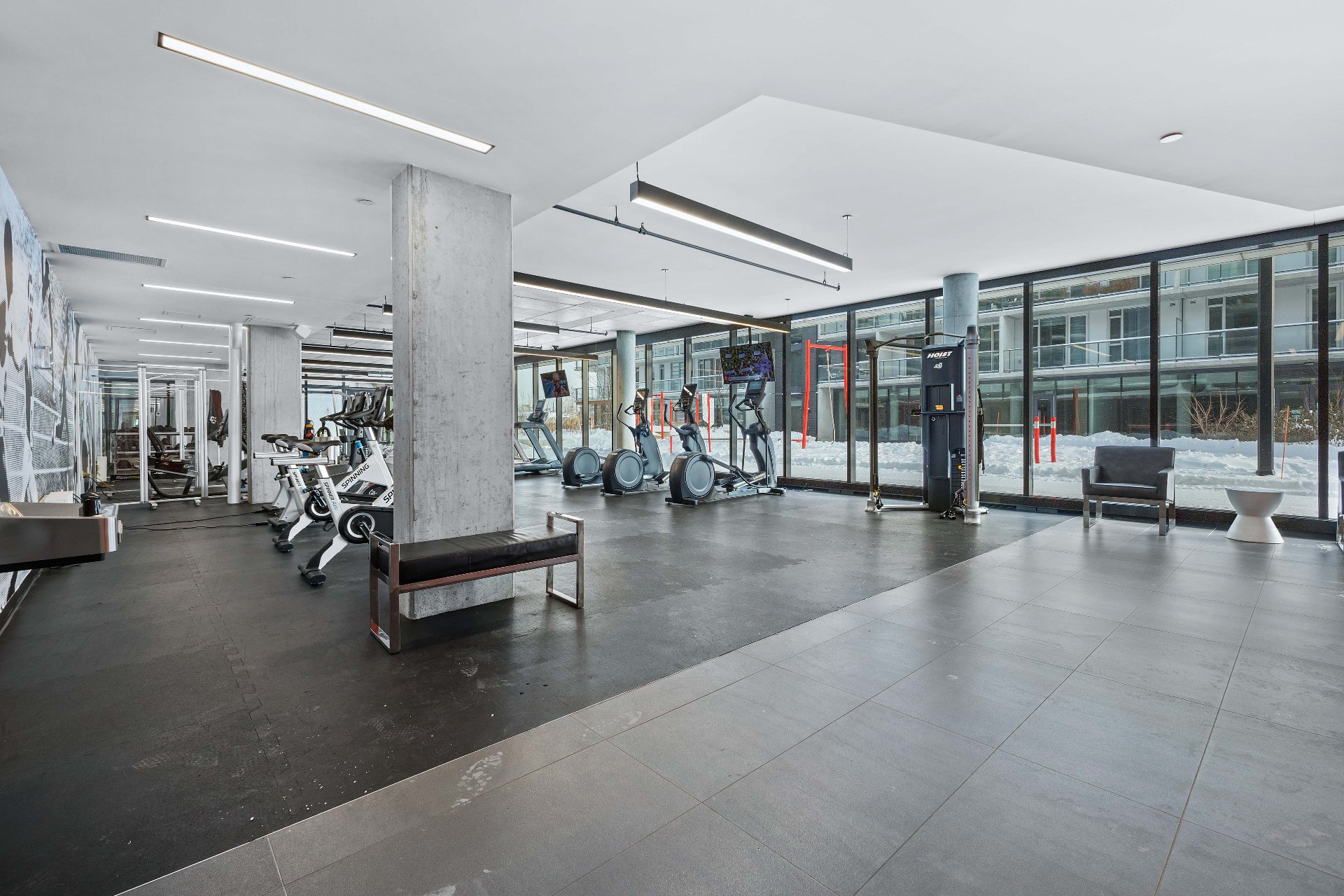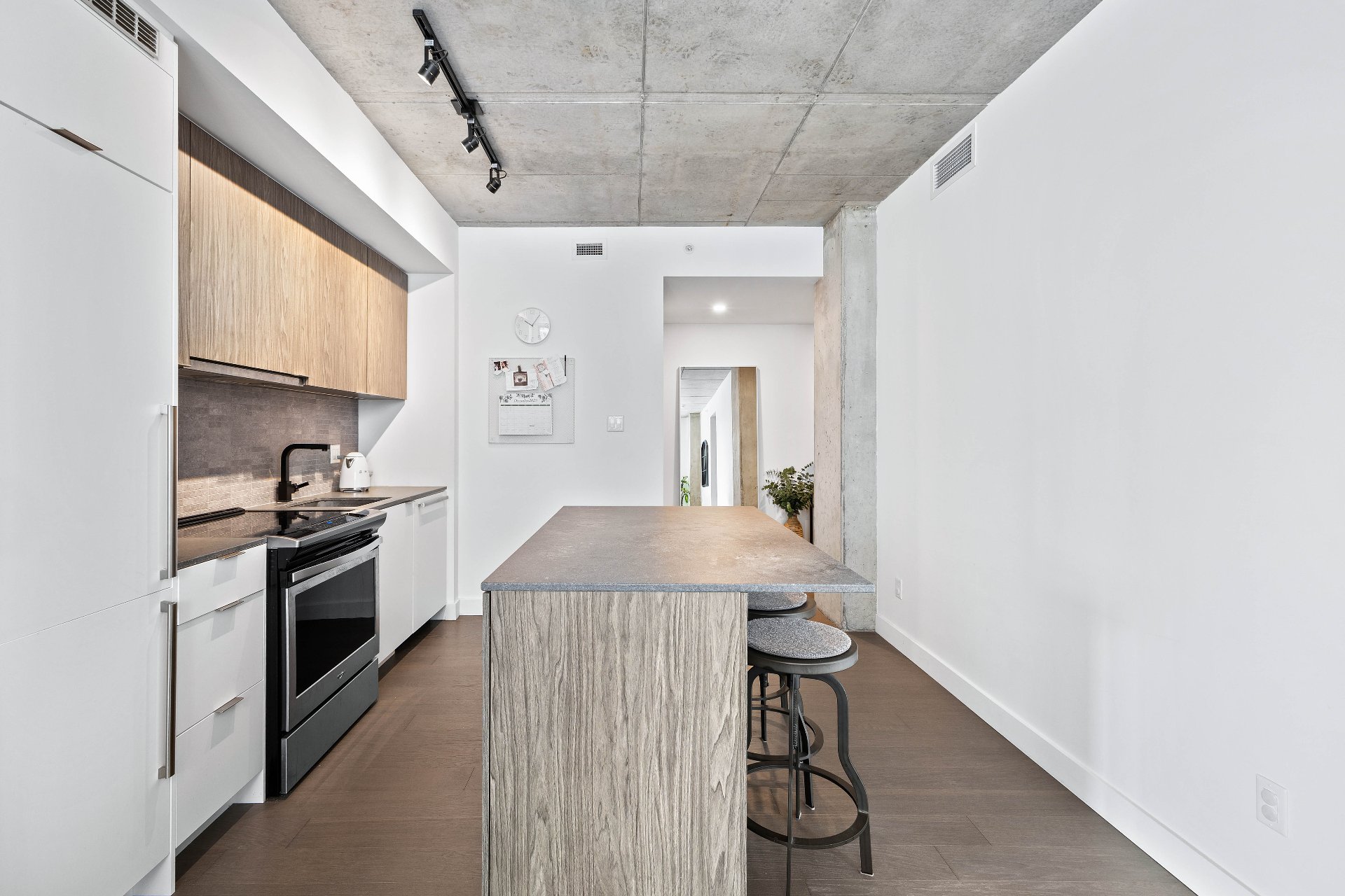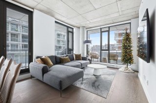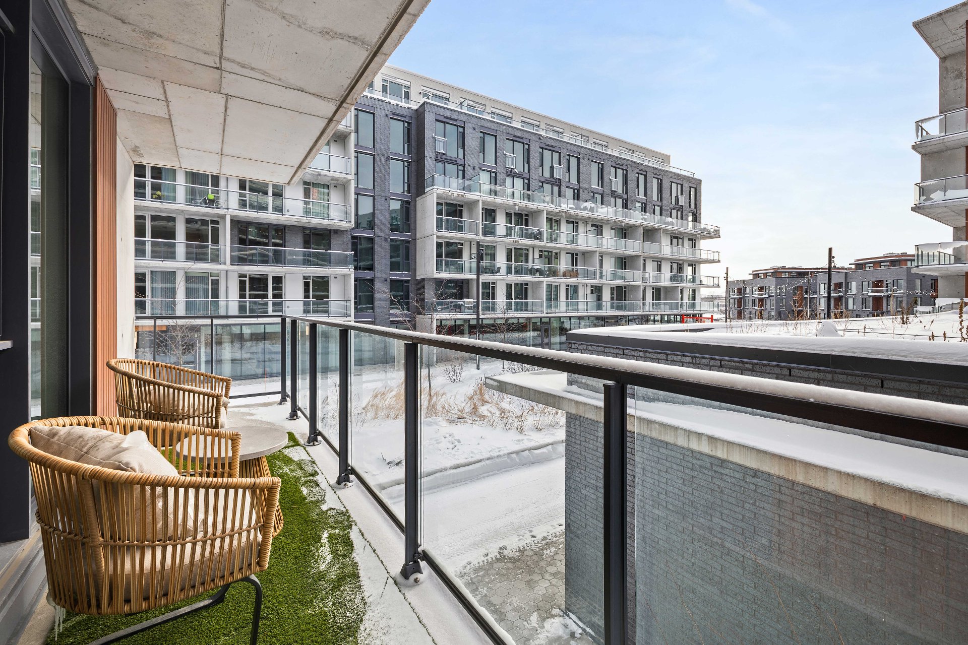 Stunning southwest-facing corner unit boasting exceptional natural light thanks to its generous windows. This condo features 2 bedrooms, 2 bathrooms, an open-concept living area, and a modern kitchen with quartz countertops. Central air conditioning and 3 balconies surrounding the unit allow you to fully enjoy sunny days. Located in the sought-after Cité Midtown project in Ville-Saint-Laurent, close to the metro, services, and with quick access to Highways 15 and 40. The building offers numerous amenities: concierge service, gym, common areas, and more. Indoor parking and storage are included. An opportunity not to be missed!