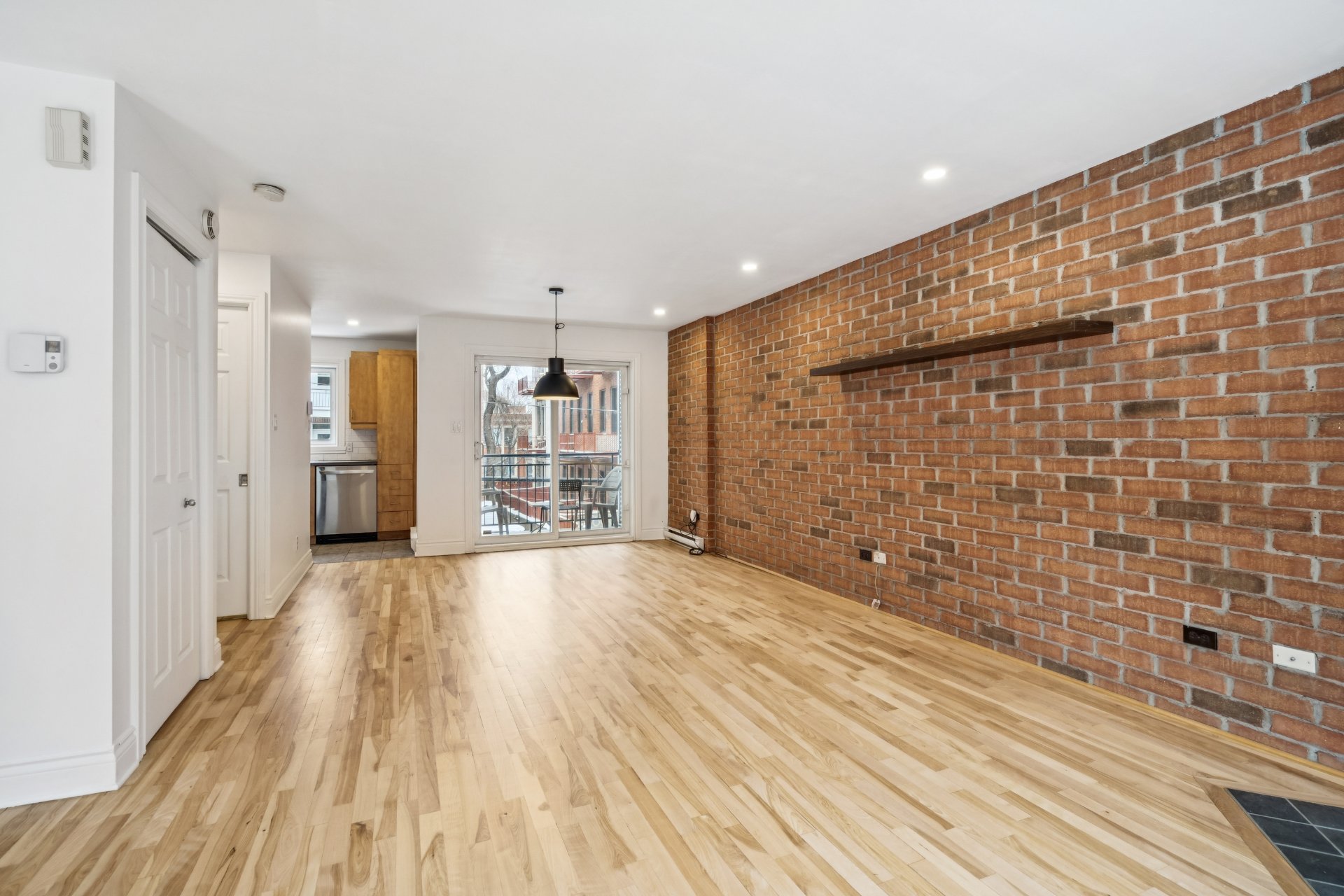 impression. The dining area, featuring a brick accent wall,