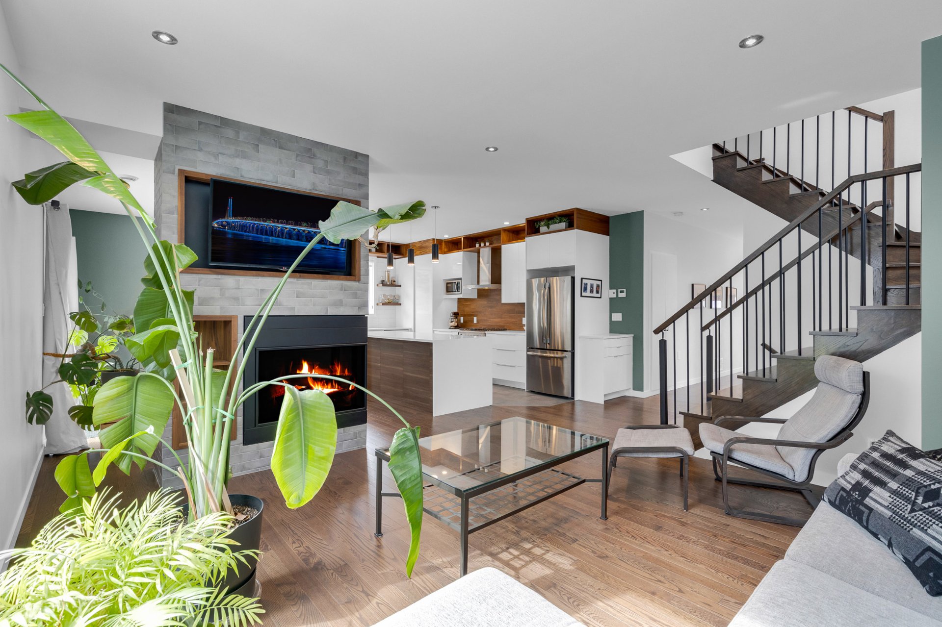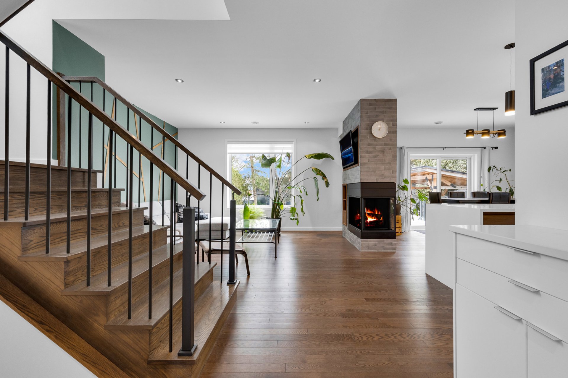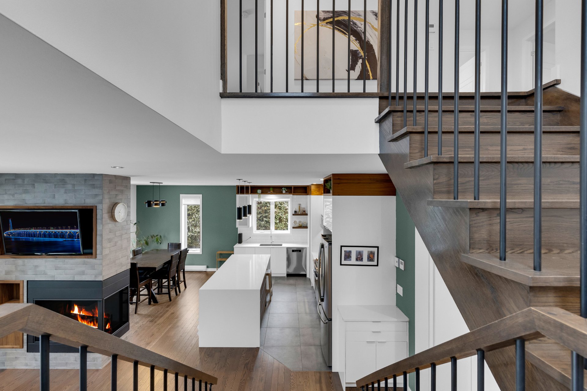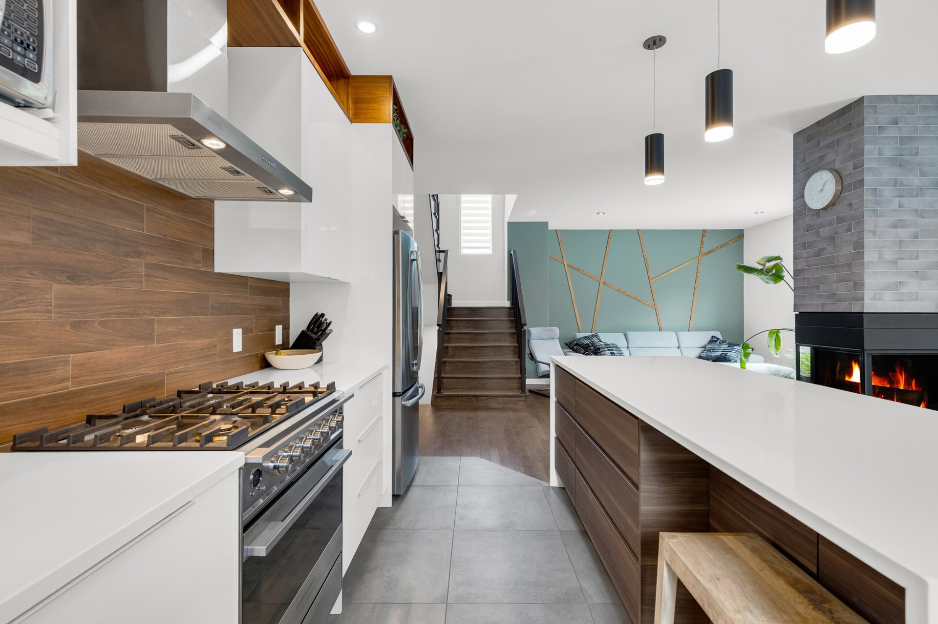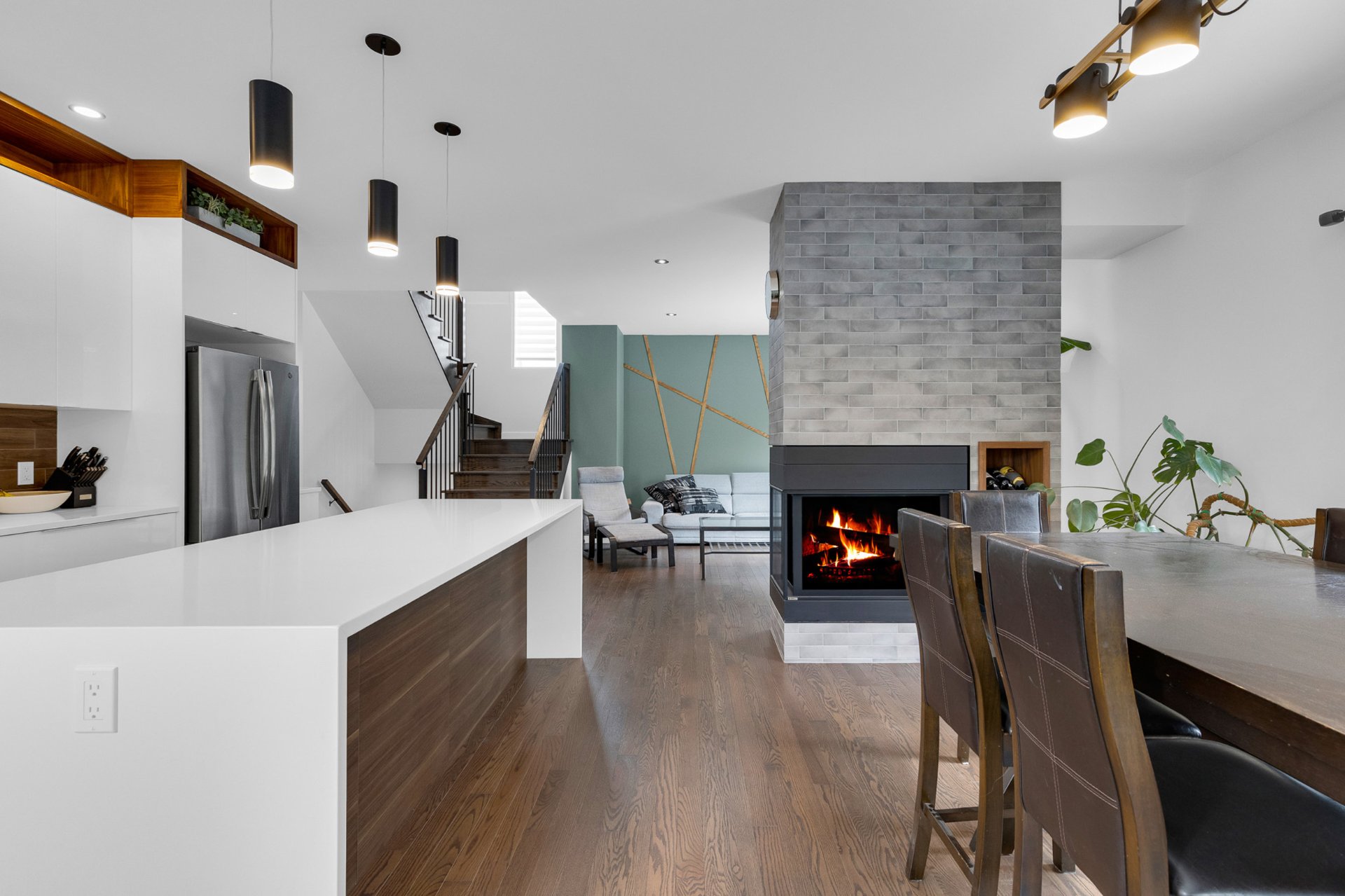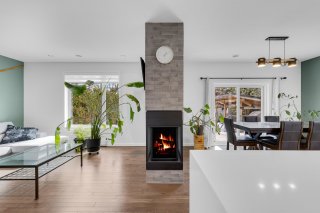 gas fireplace that subtly separates the spaces while