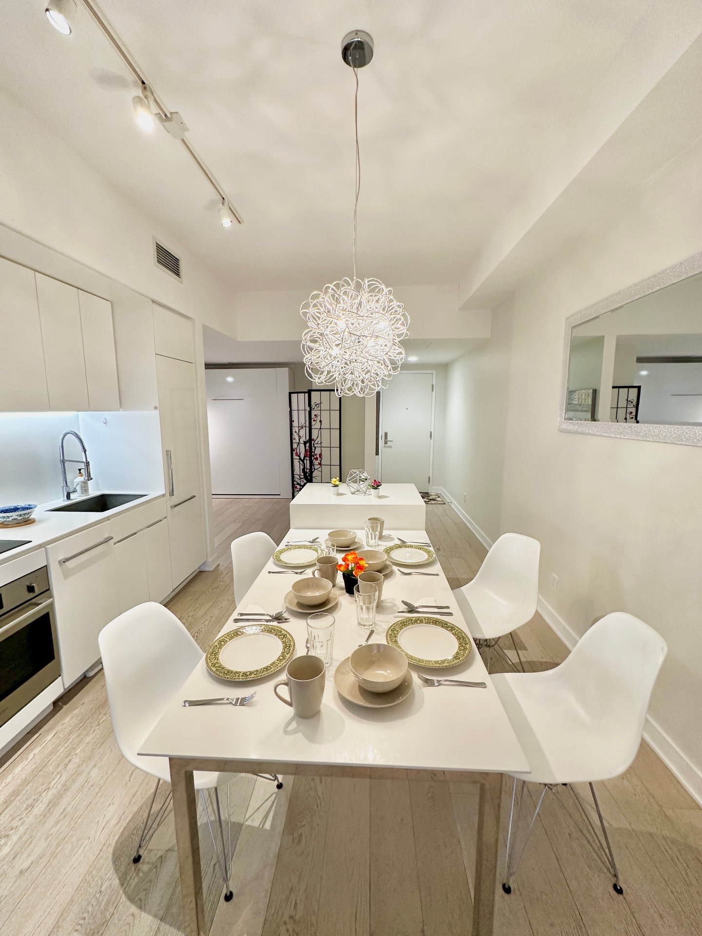 Belle cuisine avec comptoirs en Quartz et table à manger