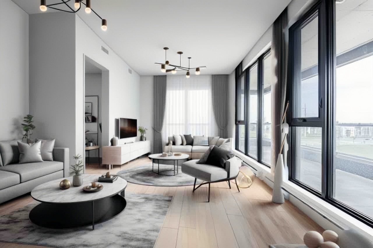 * Fenêtres pleine hauteur, baignées de lumière naturelle