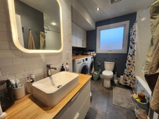 domicile. Une salle de bain soignée, une buanderie privée